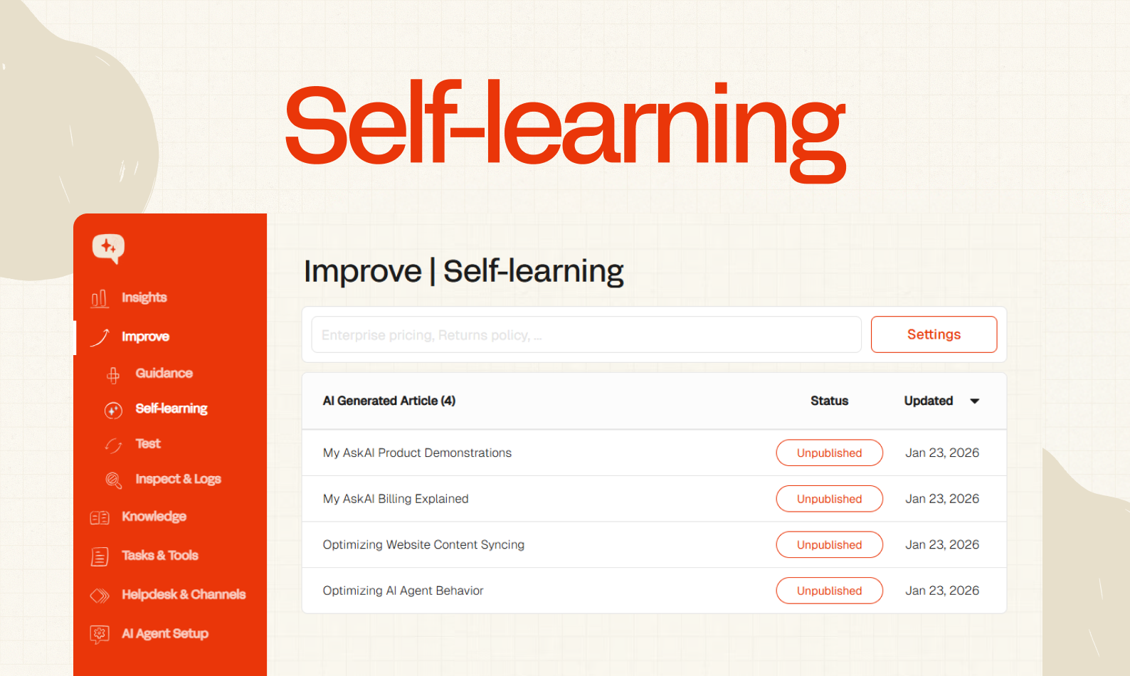 Self-learning is the ability for your AI agent to learn from your human agent conversations, ensuring that you don't have to manually update its knowledge on an ongoing basis.